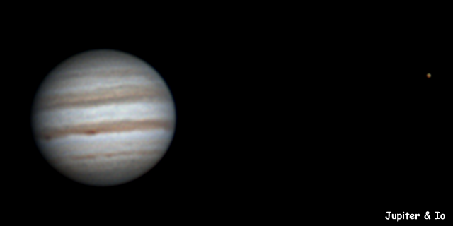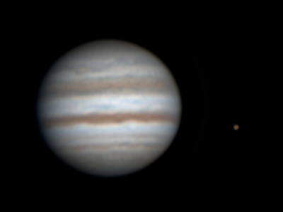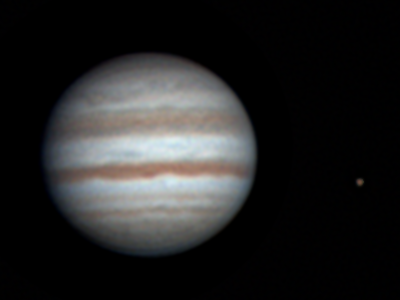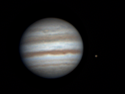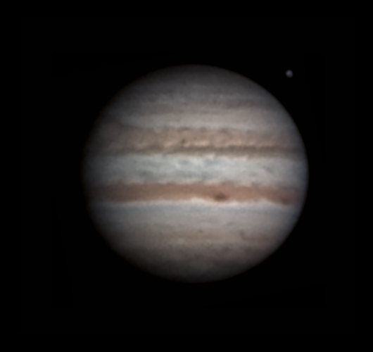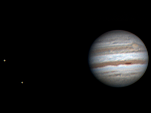 Lasse Ekblom, Nousiainen (60°37'32"N, 22°03'02"E) Klo 5.10, CM I = 192, CM II = 198, CM III = 128 "Ganymedes ja Io kohtaavat Jupiterin. Punainen pilkuu myös näkyvillä täynnä turbulenssia olevassa vyössä." |