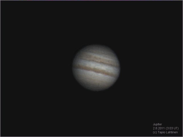 Tapio Lahtinen, Tampere Klo 6.03, CM I = 129, CM II = 226, CM III = 153 "Tämmöinen Jupiter tällä kertaa. Kokeilin eri asetuksia ja ilmeisesti sipulirengasta saa vähennettyä riittävän suurella histogrammiarvolla, tarpeeksi pienellä fps-lukemalla ja gainin käytöllä. Kuvakokoa kasvatettu 1.2x." Ks. myös http://www.ursa.fi/capella/ilmot/jupiter_020811.htm |