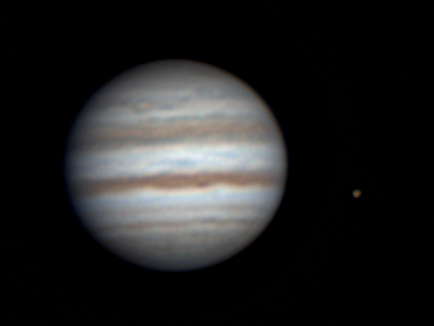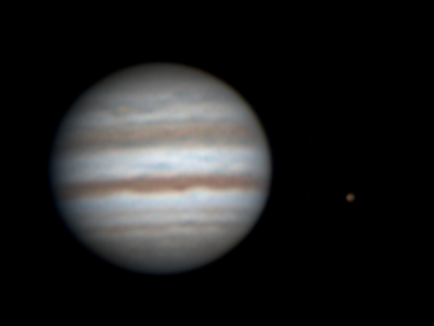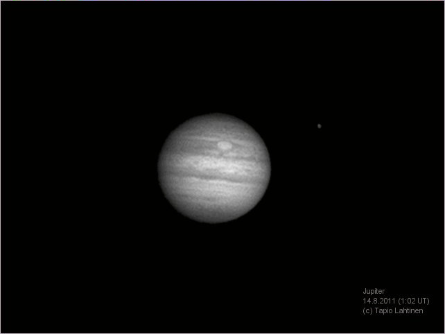 Tapio Lahtinen, Tampere Klo 4.02, CM I = 151, CM II = 157, CM III = 90 "Vaihteeksi kuvasin Powermatella ja kelin ollessa kohtuullisen hyvä yksityiskohtiakin näkyy. Eniten yllättyin, kuinka hyvin GRS tuli näkyviin IR pass -suodattimella." Ks. myös http://www.ursa.fi/capella/ilmot/jupiter_140811.htm |