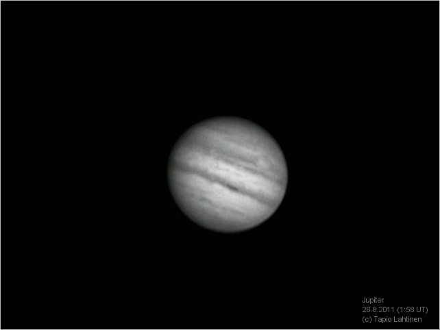 Tapio Lahtinen, Tampere Klo 5.45, CM I = 107, CM II = 13, CM III = 310 "Keli näytti varsin hyvältä ja jälkiviisautena täytyy todeta, että olisi pitänyt alkaa kuvata heti eikä odottaa putken jäähtymistä (ei nyt niin suurta eroa ollut sisä/ulkolämpötiloissa). Kun aloitin niin pilvet soivat sitten vain hyvin lyhyitä kuvausaikoja. Harmi, sillä kuten oheinen vain 160 kuvan pino osoittaa keli oli otollinen." Ks. myös http://www.ursa.fi/capella/ilmot/jupiter_270811.htm |