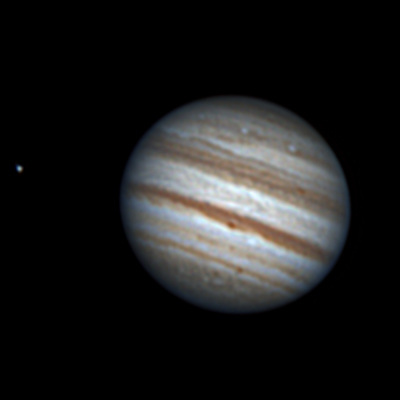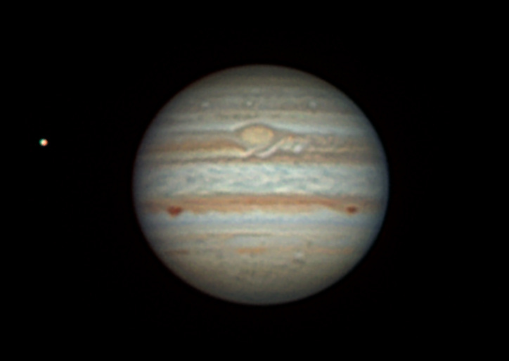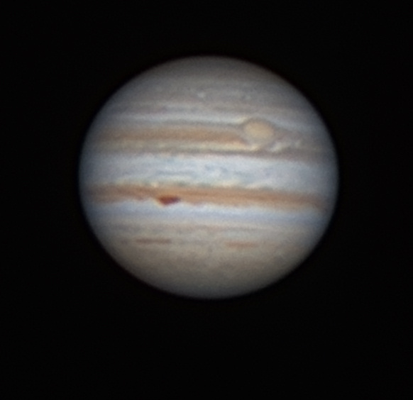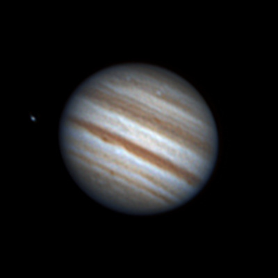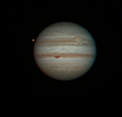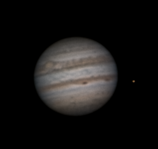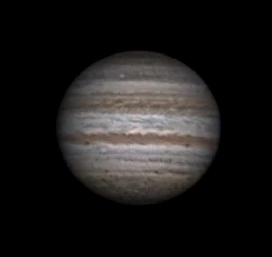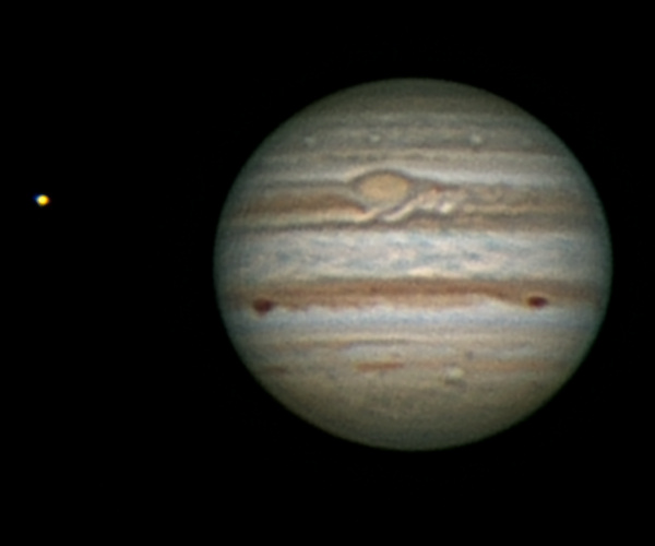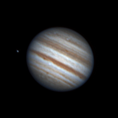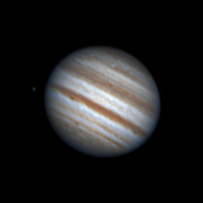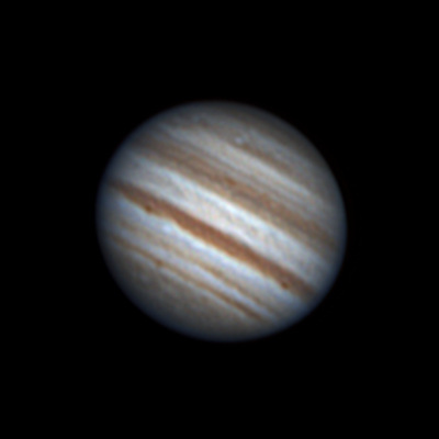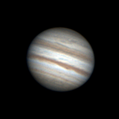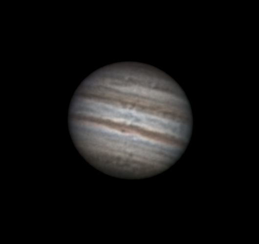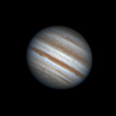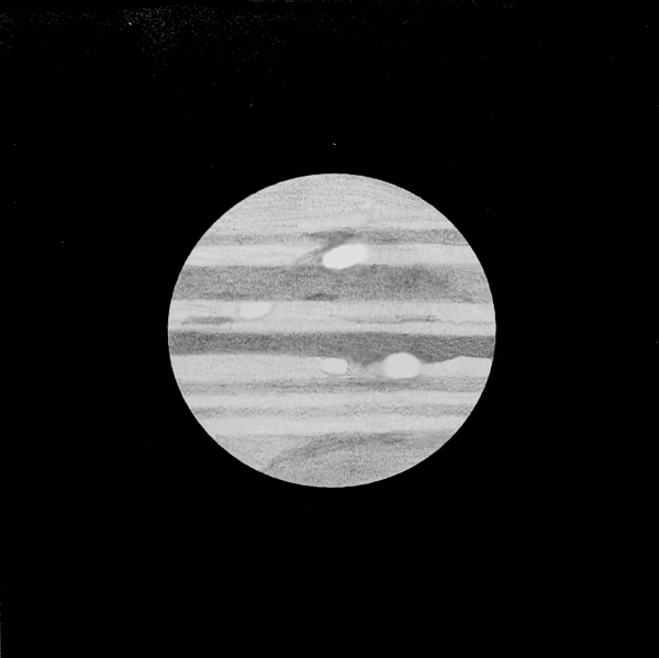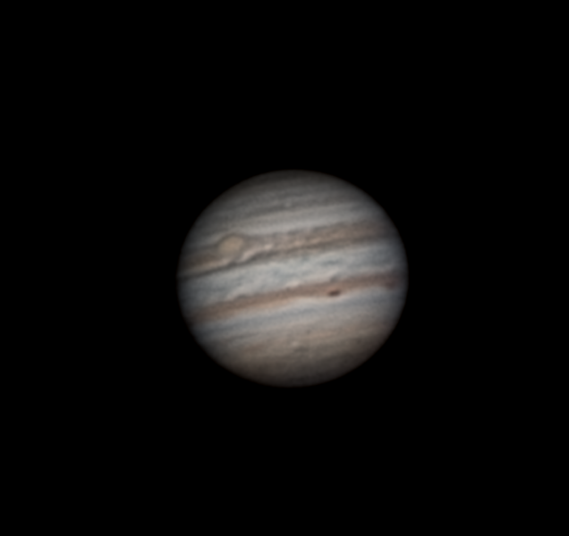 Ari Haavisto, Lempäälä Klo 23.31, CM I = 60, CM II = 315, CM III = 261 "Seeing oli surkea ja etenkin IR- ja R-alueen läpinäkyvyys myös. Pilvilautat tulivat ennekuin Jupiter ehti kovinkaan korkealle, mutta hälvenivät sitten pieneksi hetkeksi niin, että sain tämän tuikittua. Värikuvaa en saanut, kun pilvet taas tunkivat ennekuin ehdin siniseen asti." |