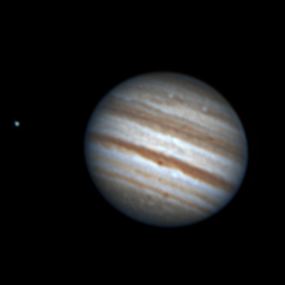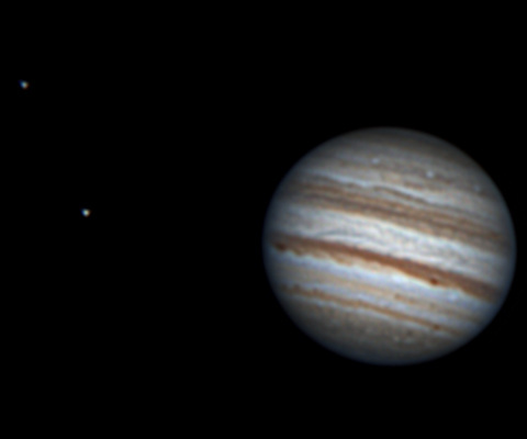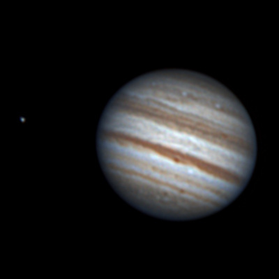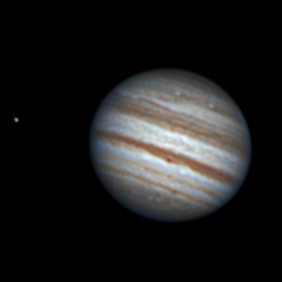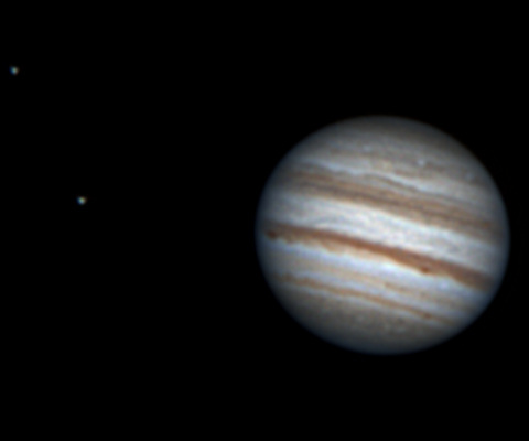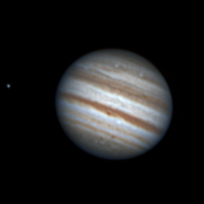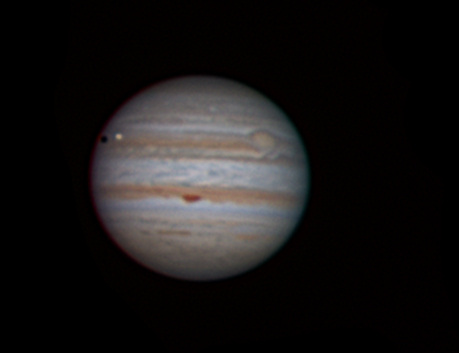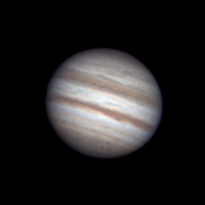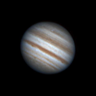Ari Haavisto, Lempäälä Klo 23.44, CM I = 296, CM II = 145, CM III = 93 suodin: RGB Klo 0.20, CM I = 318, CM II = 166, CM III = 115 suodin: IR + GB "Seeing oli surkea ja etenkin IR- ja R-alueen läpinäkyvyys myös. Pilvilautat tulivat ennekuin Jupiter ehti kovinkaan korkealle, mutta hälvenivät sitten pieneksi hetkeksi niin, että sain tämän tuikittua. Värikuvaa en saanut, kun pilvet taas tunkivat ennekuin ehdin siniseen asti. Putki jäähtyi ja Jupiter kohosi korkeammalle, mutta samaa tahtia huononi seeing. Toisena IR-G-B- kuva (koska punainen oli suttua)" |