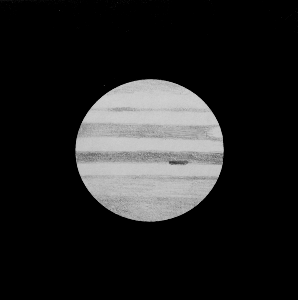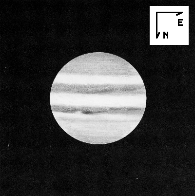 Veikko Mäkelä, Helsinki, Kaivopuisto Klo 0.03-18, CM I = 106-115, CM II = 307-316, CM III = 255-264 Klo 0.32-46, CM I = 124-132, CM II = 324-333, CM III = 273-281 "Keli oli yllättävän, vaikka toisen piirroksen aloitushetkellä seeing hetkeksi heikkeni. Yksityiskohtia näkyy melko runsaasti, joskin ekvaattorivissä oli aika vähän piirteitä. NEB:n pohjoisreunalla oli nykeröntapainen. Pohjoisella napa-alueella oli vähän epäsymmetrinen tummentuma. Joista vaaleampia alueita näkyi myös." |