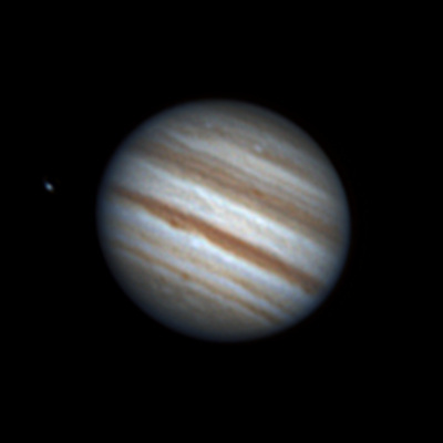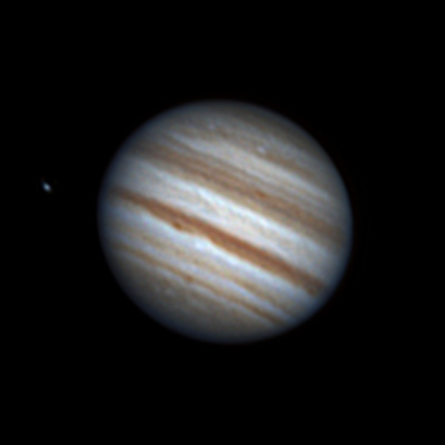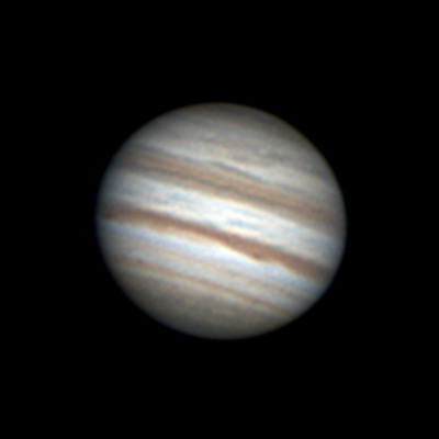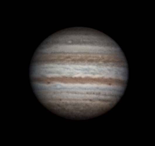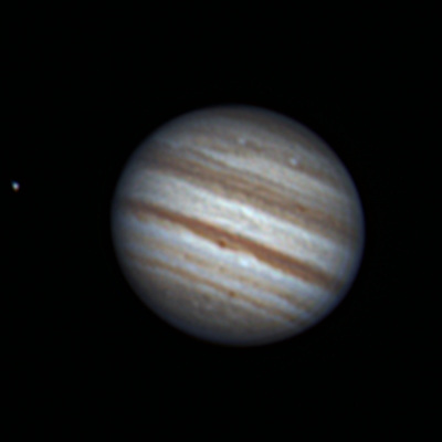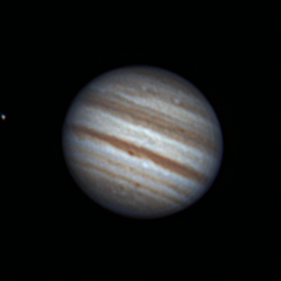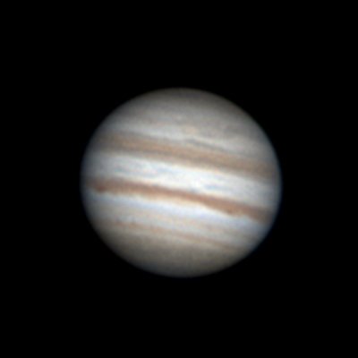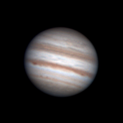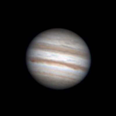 Lasse Ekblom, Nousiainen (60°37'32"N, 22°03'02"E) Klo 22.59, CM I = 225, CM II = 58, CM III = 7 "Jupiter kuvattuna hyvin matalalta. Seeing is mahdollisesti kohtuullinen." |