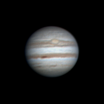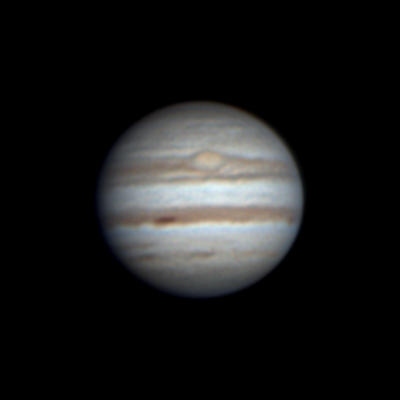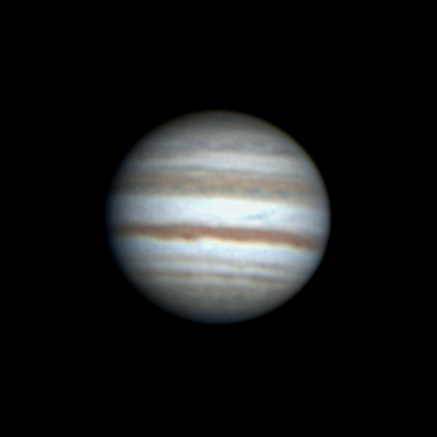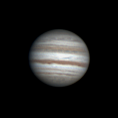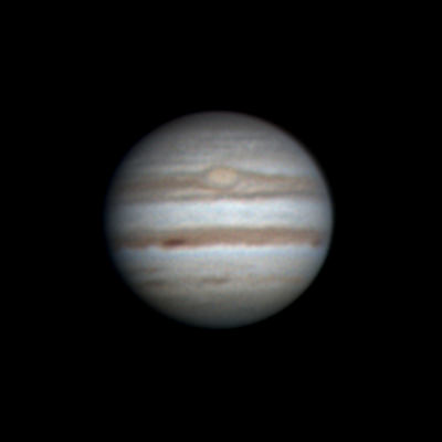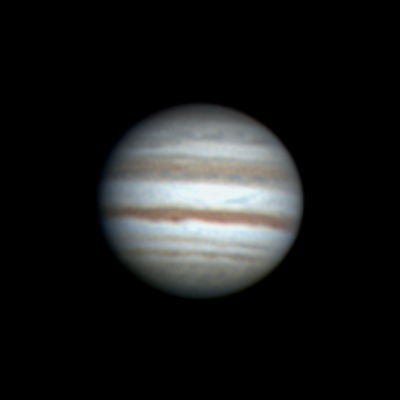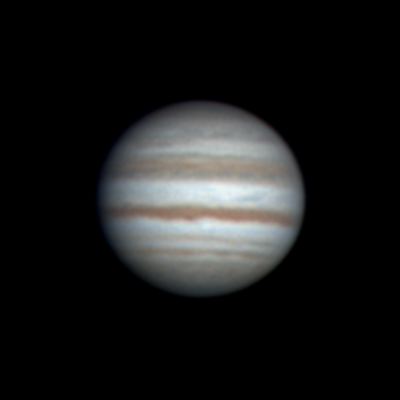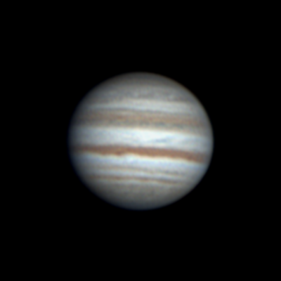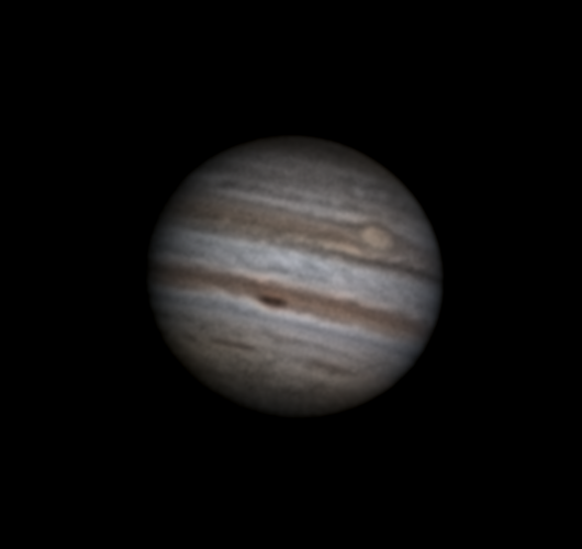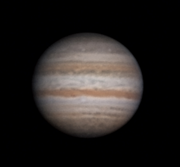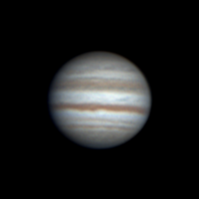 Ari Haavisto, Lempäälä Klo 22.55, CM I = 277, CM II = 316, CM III = 257 "Olin sunnuntai-iltayöstä menossa kantamaan tai paremminkin kärräämään putkea sisälle (se oli ulkona edellisen yön jäljiltä, jos vaikka keliä tulisi), kun yllättäen pilvipeitteessä olikin hetken aukkoa. Turhan matalalla Jupiter vielä oli, mutta harjoitukseksi kävi tämäkin. Annoin hiukan turhan rajusti wavelettiä ja kontrastia." |