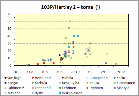 | koma | koman läpimitta kaariminuuteissa (') tai -sekunneissa (") |