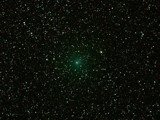 Esko Lyytinen, Artjärvi, Tähtikallio "Viikonvaihteessa oli meteorijaoston syystapaaminen. Yli puoleen yöhön mennessa taivas ei seljennyt ja kävimme nukkumaan, mutta puoli viiden jälkeen aamulla oli täysin selkeää. Menimme ulos katsomaa komeettaa. Ja näimmekin sen paljain silmin. Oli melko lailla näkymisen rajoilla eli näkyi ajoittain lievällä syrjäsilmällä. Oli kuitenkin ihan oikeassa paikassa lähellä olleisiin muutamaan mag 5 ja 6 välissä olleeseen tähteen verrattuna. Ensin katsoin 20 x 80 kiikreilla. Hankaluutta tuotti painavien kiikareiden kanssa lähinnä se että oli melkein pään päälle. Nähtyäni paljain silmin katsoin myös 5,5 kertaa suurentavalla monokoulaarilla (objektiivina kameran linssi). Siinä oli tarkennusvaraa mutta alkoivat jo mennä komeetta ja lähin vertailutähti päällekkäin. Siinä vaiheessa näyttivät pläntit juuri yhtä kirkkilta. Koska komeetta kuitenkin vaikutti suuremmalta niin ajattelin että täytyy korjata sen kirkkautta ylöspäin (kirkkaampaan). Kuitenkin katsomalla valokuvasta koman leveyttä niin kyseinen epäterkennus oli riittävä kun vartaa komeettajäljen keskustaan. Eli annan sille arvioksi saman. Laitoin kameran kuvaamaan kiinteällä jalustalla 15 sekunnin otoksia. Niitä otin 47 kappaletta (plus varmuuden vuoksi kaksi darkkia) eli kuvien valotusta tuli yhteensä vähän toistakymmentä minuuttia." |