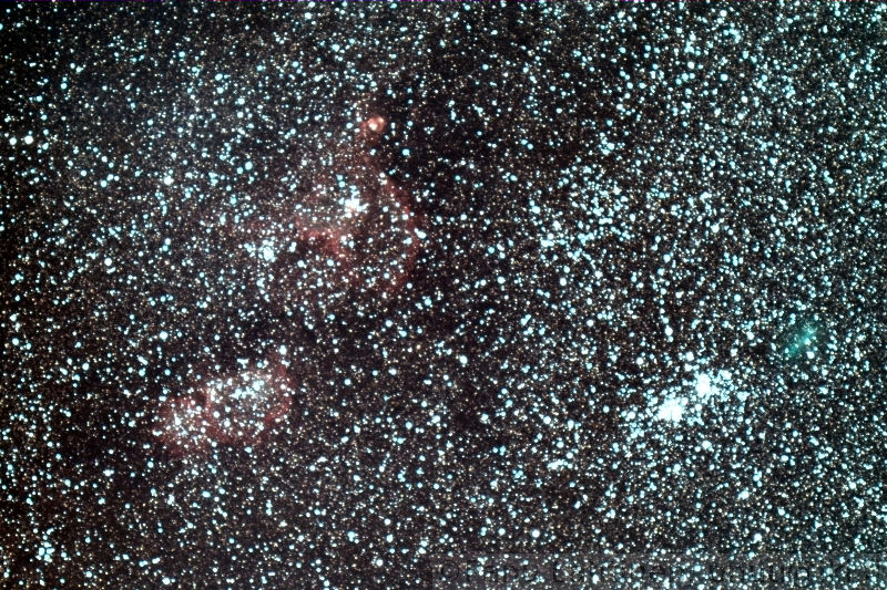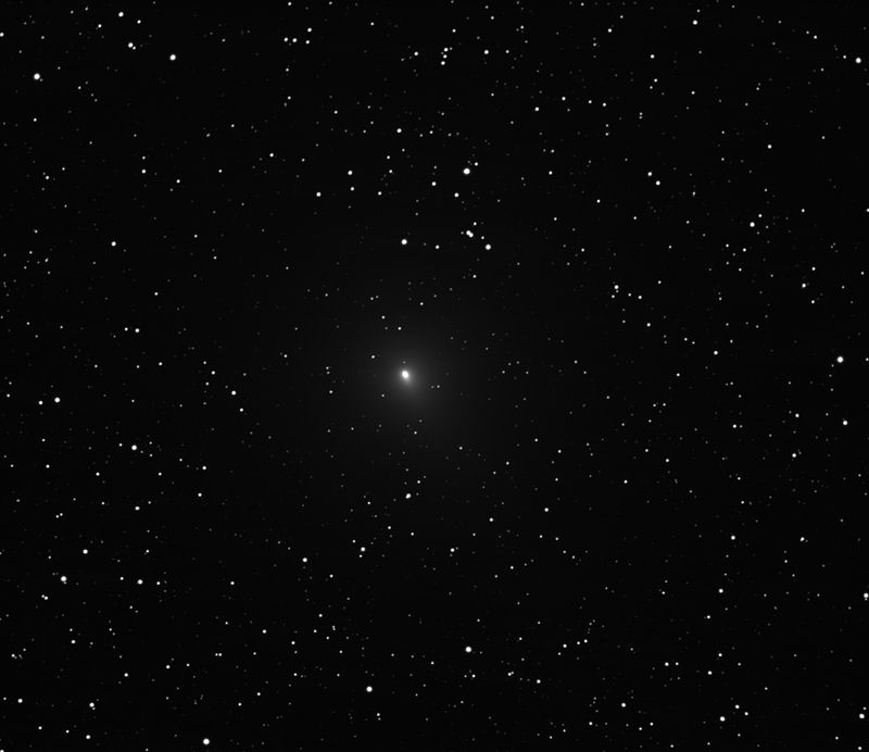 Jorma Ryske, Helsinki, Maunula "Kuvakenttä 27'x34', N noin "klo 11" suunnassa, E "klo 8". Kirkkain tähti komeetasta länteen TYC 3705-30-1 10.1 mag. Komeetta liikkui reipasta vauhtia käytetyllä 600mm polttovälillä. Minuutin kertavalotuksilla se oli liikahtanut selvästi ja pidemmillä kertavalotuksilla olisi pitänyt jo autoguidata itse komeettaa, nyt ei ollut autoguidausta ollenkaan." |
