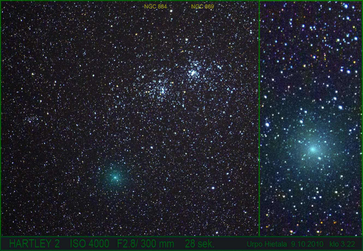 Veijo Kallio, Lumijoki (A70) "Lokakuussa komeetta oli lähimmillään Maata ja samalla kirkkaimmillaan, mikä näkyy kuvista. Samalla sen näennäinen liikkeen nopeutuminen tähtien suhteen näkyy yhä pitempinä tähtihelminauhoina summakuvissa." Ks. myös http://kotisivu.dnainternet.net/jblkdjgk/103pHartley2sivu2.htm |