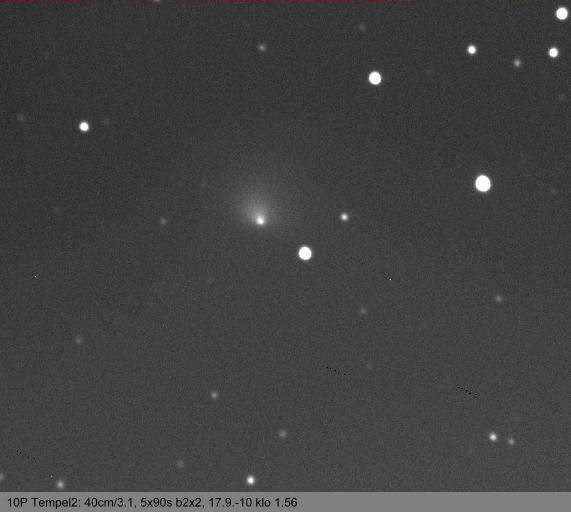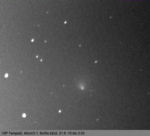 Antti Kuosmanen, Nummi-Pusula, Saukkola "Pääsin avaamaan kauden komeettahavaintojen osalta. Kuvattu teleobjektiivilla ja CCD-kameralta. Rajatut kuva, pino keskiarvo nrljästä kuvasta. Hento pätkä piikkimäistä pyrstöä." Ks. myös http://akuo.iki.fi/cgi-bin/wiki.pl?10P_%28Tempel%29 |
