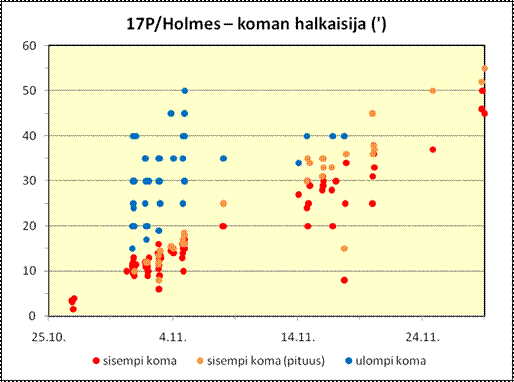 koman läpimitta kaariminuuteissa (') tai -sekunneissa (") |