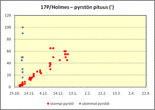 pyrstön pituus asteissa (°) tai kaariminuuteissa(') sekä