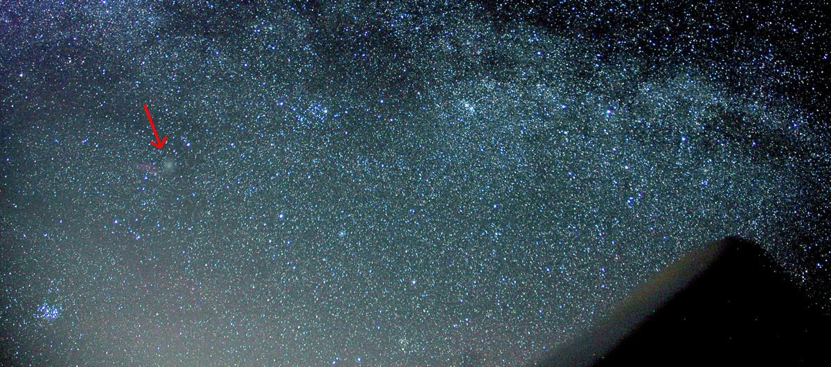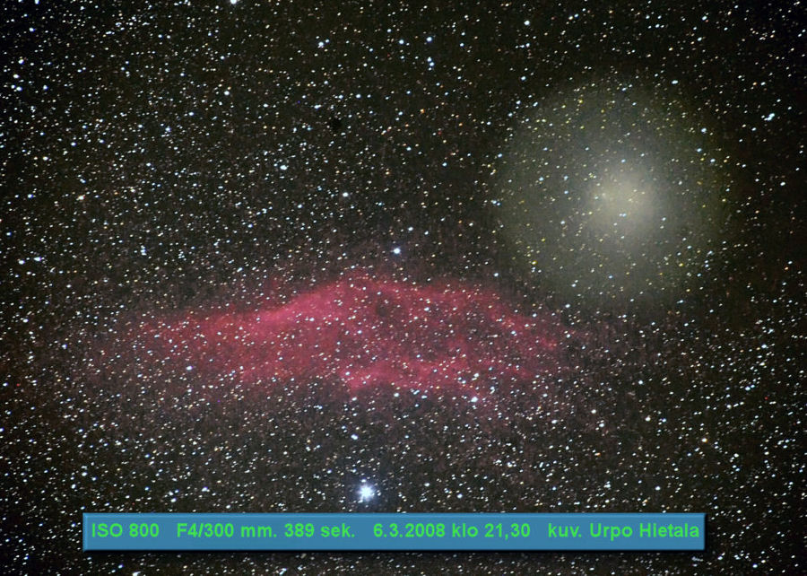 Kamerasta loppui akku, kun olin kuvaamassa komeetta ja Kalifornia-sumua. Kun latasin akkua niin kohde oli jo laskenut matalammalle ja pilviä oli alkanut tulla taivaalle ja linssi oli valitettavasti huurtunut jo aika paljon. Näistä syistä en saanut Kalifornia-sumua kovin hyvin näkyviin, mutta alla aika kovasti Adobe Lightroomilla käsitelty kuva, hävitin käsittelyn parametritkin, enkä pystynyt enää myöhemmin saamaan samalla tavalla käsiteltyä... Lightroom, kun ei muista kuin yhden historiaketjun... Kuvan oikeassa alareunassa on puun latva."
