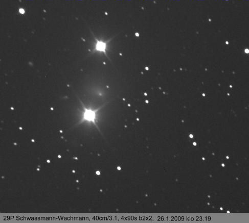 "Tammikuun edetessä komeetan ytimestä huomattiin lähtevän jonkinlaisen suihkupurkauksen, joka näkyy seuraavassa kuvassakin alaspäin (etelään) suuntautuvana väkäsenä. Vasemmalle yläviistoon näyttää purkautuvan enemmän materiaa myöskin. Jääsumu huononsi kuvan laatua."