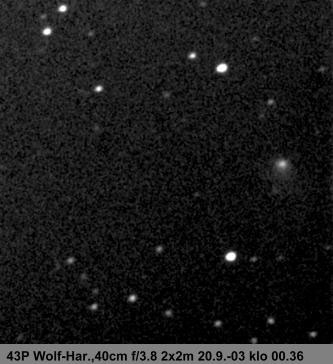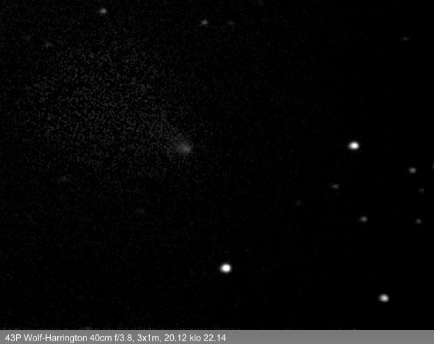 "Heikkolaatuinen, utupilvilauttojen lomasta otettu yhdistelmäkuva komeetasta 43P Wolf-Harrington, joka oli kuvaushetkellä jo laskemassa lounaaseen puiden taakse. AstroArt antoi kirkkaudeksi muutamien tähtien avulla vain 13.2 mag."