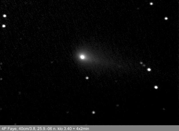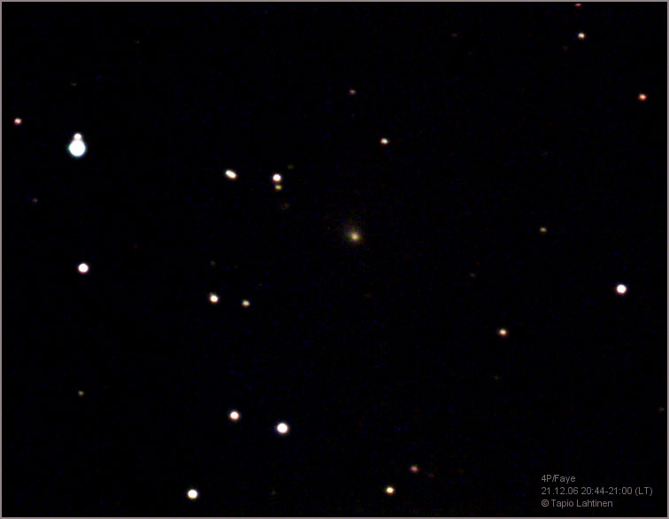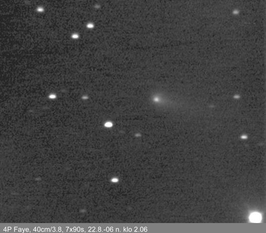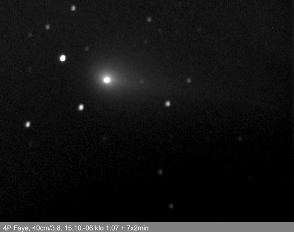 "Faye kuvattu Evitskogissa. Kompakti koma, pitkähkö pyrstö. Kuva leikattu kokokuvasta, pikselikoko kuvissa on 1,72 kaarisekuntia / pikseli. Kuvien käsittelyssä käytetty AstroArt 3.0:n DDP-filtteriä."