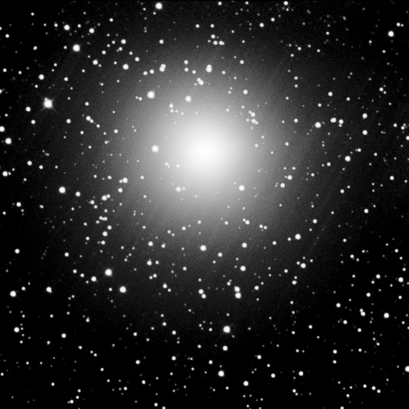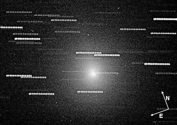 Komeetasta ei fotometriaa enää tällä tavalla irtoa, koska koma on liian suuri ja kirkkaat vertailutähdet ovat saturoituneet kuvassa. Vähän perinteisemmin pinottu keskiarvokuva lineaarisella historgrammilla osoittaa, että koma on itse asiassa hyvin keskittynyt."