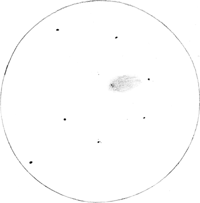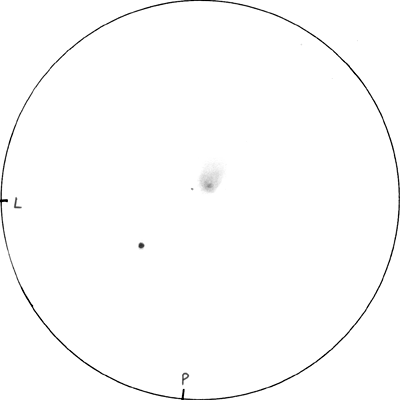 "Komeetan täplämäisessä päässä erottui tähtimäinen kirkastuma. Komasta itään oli vaikeasti hahmotettava 'viuhkamainen' hehku, jonka suunta oli ainoa, josta sai jotakin käsitystä. Epätarkkuusmenetelmällä itäpuolell olevan tähden kirkkaus (9 mag ) vastasi kutakuinkin komeetan kokonsikirkkautta. 'Viuhkan' pituus oli hieman yli 1/3 itäisten tähtien välimatkasta."