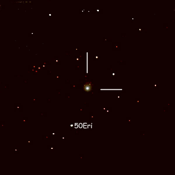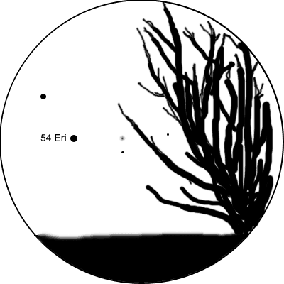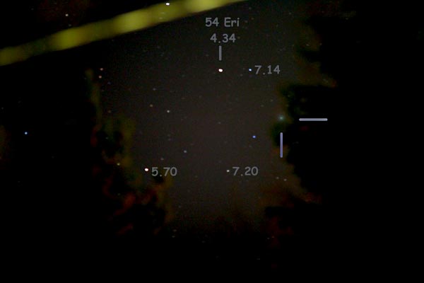 "Magnitudi epätarkennuksella, digikuvaus oli aikamoista sähläystä katuvaloissa. Kohde oli sangen iso ja löytyi helposti, kunhan tuli pois puiden takaa: 60 Eridanin osaltaan muodostamasta pikku vinoneliöstä kun lasketteli vaan alas löyhää tähtirimpsua, niin sieltä se tuli aina vastaan.Pyöreä pallo eli ei aavistustakaan pyrstöstä."