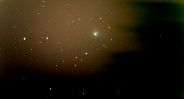 "Onnistuin kuvaamaan komeetan sen noustessa täällä jo noin 5 asteen korkeudelle horisontista. Vaikka lähellä horisonttia ja ylempänäkin esiintyi utupilvisyyttä, kohde kirkkautensa takia erottui helposti jo kaukoputken etsimenkin läpi. Ensireaktioni kuvan piirtyessä kuvaruudulle oli, että onpas se iso. Kuvassa koman läpimitta on leveyssuunnassa noin 6', mutta korkeussuunnassa se näyttää ainakin alkuperäiskuvassa heikentyneenä jatkuvan ylöspäin (=pohjoiseen) kuvakentän ulkopuolellekin eli koman läpimitta kuvassa näyttäisi tässä suunnassa olevan vähintään 7'. Ehkä siinä on havaittavissa pientä alkavaa pyrstöntynkää. Mainittakoon, että kokeilin kuvaamista myös käyttäen 30 ja 60 sekunnin valotusaikoja, mutta tässä yhdistelmäkuvassa koma näkyi laajimpana."