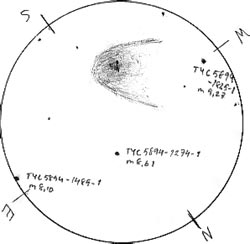 "Toinen havaintokerta. Komeetta jo korkeammalla, mutta silti kovin matalalla. Pyrstö näkyvssä suuren kirkkaan koman lisäksi."