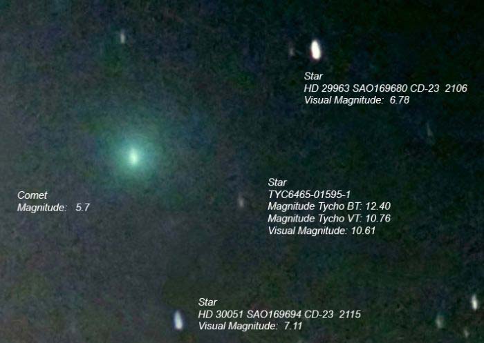 "Kuvattu ilman seurantaa. Kuvaa rajattu suuresti. Kuva-alueen leveys noin 1,1 astetta. 7x50 kiikarilla komeetta näkyi hieman epäsymmetrisen oloisena ututäplänä, jonka koko luokkaa 7 kaariminuuttia. Kohde oli helppo löytää Jäniksen Betan ja Epsilonin yhdyslinjaa seuraten. Havaintosää selvästi parempi kuin 3/4.12. Valosaasteen ja varsin vähäisen altitudin johdosta komeetta oli käytetyllä kiikarilla suoraan katsottaessa lähellä havaintokynnystä. Kohde kuitenkin näkyi koko ajan. Kuvassa ilmenevää valon keskittymistä en havainnut. Visuaalihavaintoa pitää yrittää isommalla instrumentilla. Komeetan alla SAO 169924, mag 7,11, yläoikealla SAO 169680, mag 6,78."