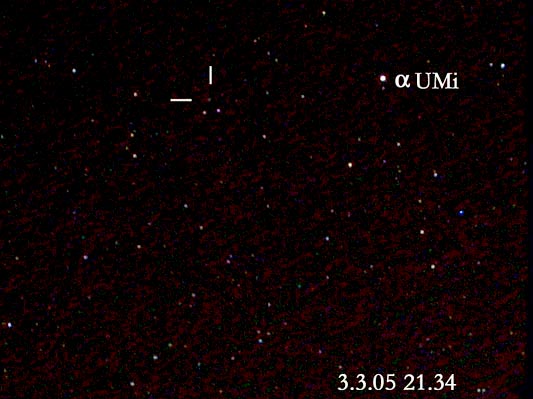 "Komeetta ei enää erottunut paljain silmin, mutta sain sen kuvaan digikameralla. Komeetta on niin lähellä Pohjantähteä, että kuvaa voi valottaa ilman seurantaa. Se erottuu kuvissa noin 6 - 6,5 magnitudin tähtenä."