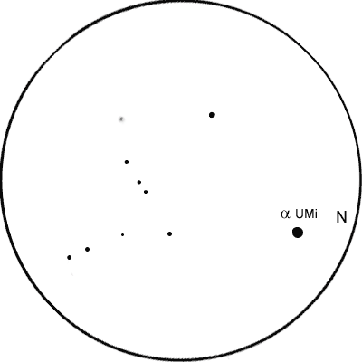 "Komeetta on hyvin lähellä Pohjantähteä. Se ei enää erotu paljain silmin, mutta linssikaukoputki toi sen helposti esiin. Kaukoputkella pyrstö erottui kohtuullisesti. Kuva on otettu digiscoping-menetelmällä kaukoputken läpi 40 mm okulaarilla. Komeetta on niin lähellä Pohjantähteä, että kuvan pystyi ottamaan ilman seurantalaitteistoa. Tasojen ja histogrammin säätö toi komeetan hyvin esiin."