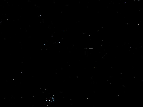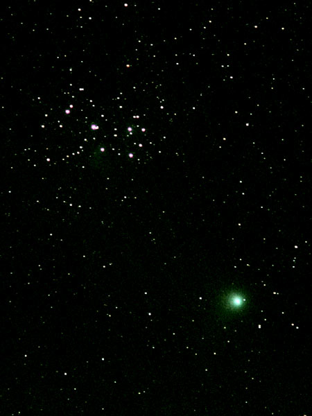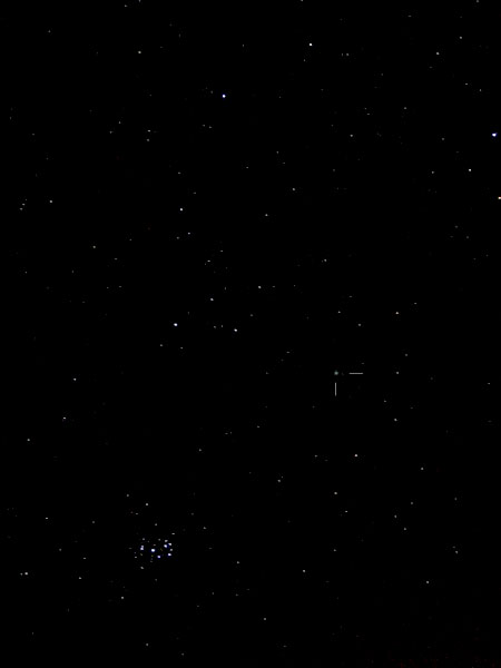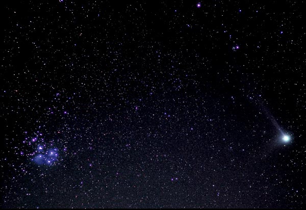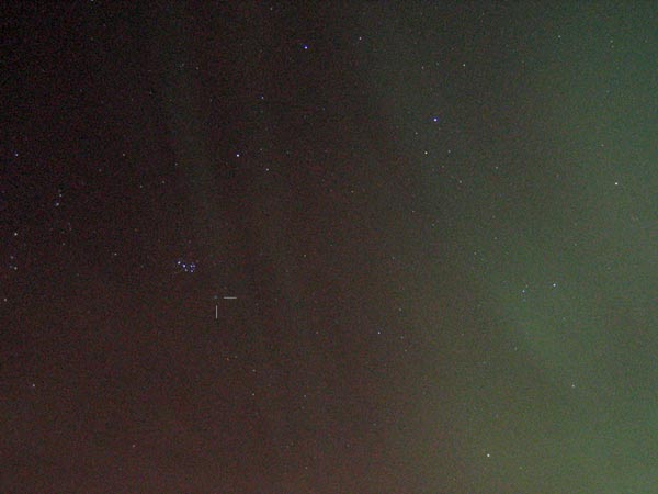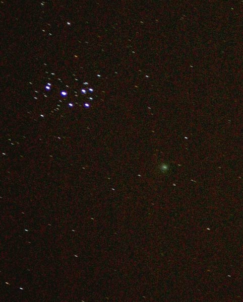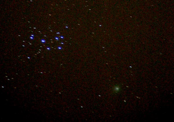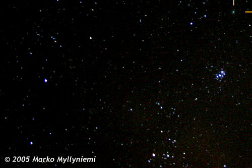 "Pilvissä oli yllättäen aukkoja, joten viritin kameran ja syöksyin ulos kuvaamaan. Onnea riitti yhden valotuksen ajan, jolloin komeetta näkyi hienosti Plejadien vieressä. Komeetan ydin on mielestäni yhtä kirkas ellei kirkkaampi kuin Atlas ja Alcyone, ehkä noin magnitudia 3. Pyrstö on edelleen heikosti havaittavissa, mutta noin 90° suunnassa sitä on jonkin verran nähtävissä. Komeetta on mielestäni vihertävä. Klo 23 jälkeen alkoi jälleen pilveillä, joten tämä jäi ainoksi saaliiksi."