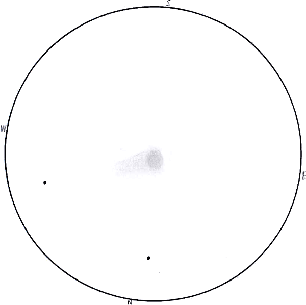 "Utu alaoikealle Seulasista. Ei yksityiskohtia eikä muotoa, mutta yllattavan kookas. Kirkkaus karkeasti arvioitu suhteessa Seulasiin."