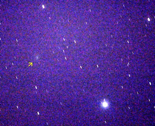 "Valotus ilman seurantaa. Kuvaa rajattu suuresti. Kuva-alueen leveys noin 115 kulmaminuuttia. Kuvaa käsittelemällä Machholz vielä löytyy. Kirkas tähti delta UMa, joka suuresti helpotti kohteen saamista ruudulle."