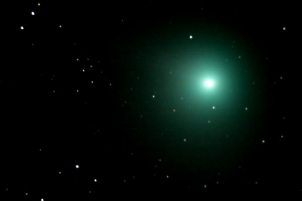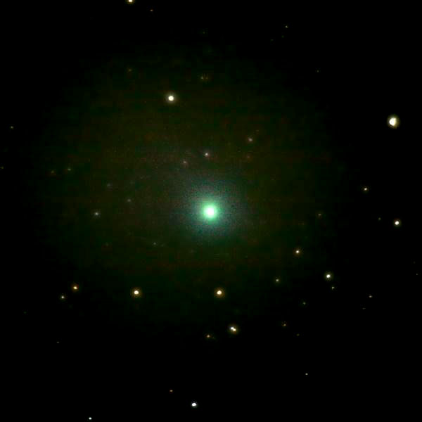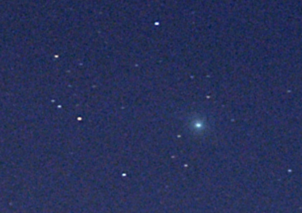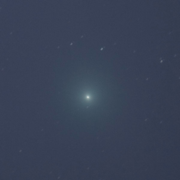 "Kuvaa rajattu. Kuvattu Helsingissä varsin valosaasteisissa oloissa ilotulitteiden savuttamalta taivaalta. Kirkastumista on selvästi tapahtunut. Ei aavistustakaan pyrstöstä. Vasemman ylänurkan kirkkain tähti SAO 658523, mag 7,42."