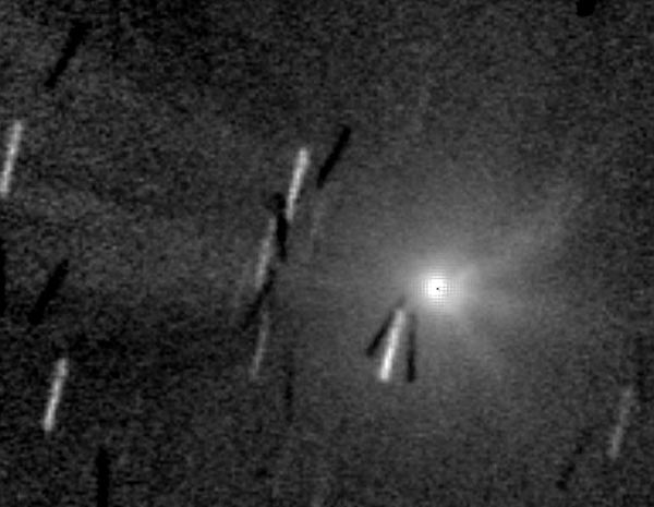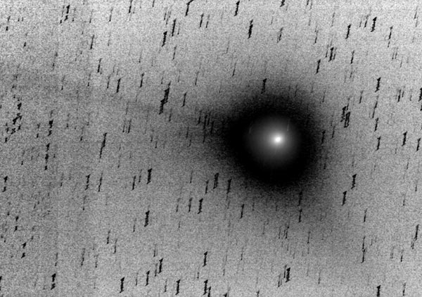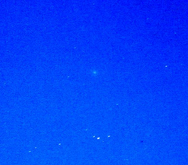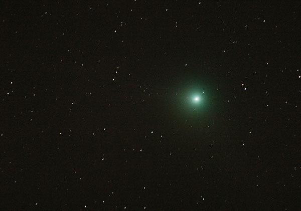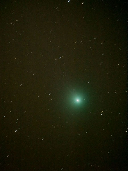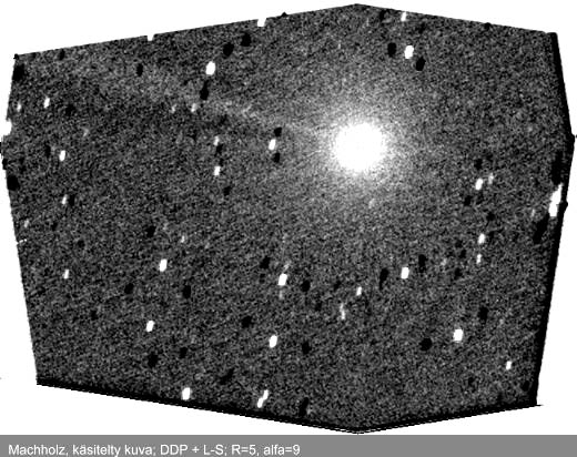 "Komeetta näkyi Etelä-Suomen Kosmologisen seuran Halkian tornilla hyvin myös paljain silmin. Kiikarilla erottui koman epäsymmetria, jonkinlaiset pyrstöntyngät suunnilleen itään ja etelään. Värikuva pinottu paremmin seuratuista kuvista. Mustavalkoiseen pinottu huonomminkin seuratut kuvat pyrstön saamiseksi kuvankäsittelyllä esiin. Molemmissa kuvissa alue 1x1,5 astetta."
