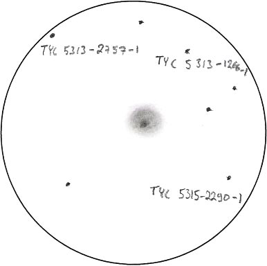"Ensimmäinen usean kuvan valotus digikameralla ja ensimmäinen yhdistäminen ohjelmalla. Pitkän pilvisyysjakson jälkeen vihdoin tähtiä näkyvissä. Keli näytti jo kotoa lähtiessä tosi kehnolta, vain kirkkaimmat tähdet, Saturnus ja Kuu näkyivät. Tornilla päätin kuitenkin yrittää, vaikka pääpeili näytti aivan valkoiselta (täynnä jääkiteitä). Suuntaustähtiä ei paljain silmin tahtonut nähdä lähettyviltä kuin ajoittain. Kohteen löydyttyä se näkyi kameran tähtäimessäkin melko hyvin, tarkentamaan ei kuitenkaan varmuudella pystynyt. Otin muutamia kuvia fokusointia kokeilemalla, lopulta tarkensin kyllin kirkkaaseen tähteen."