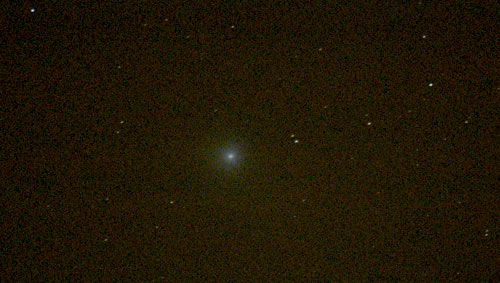 "Kun kinkut oli aattona syöty ja lahjat saatu, nappasin kiikarit, digikameran ja jalustan ja lampsin minäkin pihalle komeettajahtiin ja raikasta pakkasilmaa haukkaamaan. Kiikarilla komeetta löytyi muutamassa sekunnissa, mutta miltei täysikuu ja pakkassumu veivät taivaan läpinäkyvyyden lähes täysin ja latistivat luonnollisesti visuaalista nautintoa. Nappasin kuitenkin luonnonoloja uhmaten pari digikuvaa komeetasta. Jos tuosta osasuurennoksesta lähtisi pyrstöä hakemaan, niin veikkaisin tuonne koillisen suuntaan (pohjoinen kuvassa ylhäällä ja itä vasemmalla)."