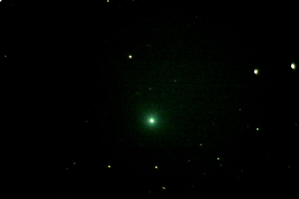 "Uskaltauduin rakettien räjähdellessä naapurustossa roudaamaan kaluston ulos ja nappaamaan ensimmäiset CCD-kuvat. Itse asiassa komeetta oli tänään ensimmäistä päivää noussut puiden yläpuolelle meidän pihasta katsoen, joten heti ensimmäinen ilta tuli hyödynnettyä. Paljain silmin en komeettaa nähnyt ja 7x50-etsinputkessakin näytti aika himmeältä, tosin ytimessä tiivis piste. Keli oli hiukan tuulinen, joten jouduin käyttämään lyhyttä valotusaikaa ja 2x2-binningiä.
