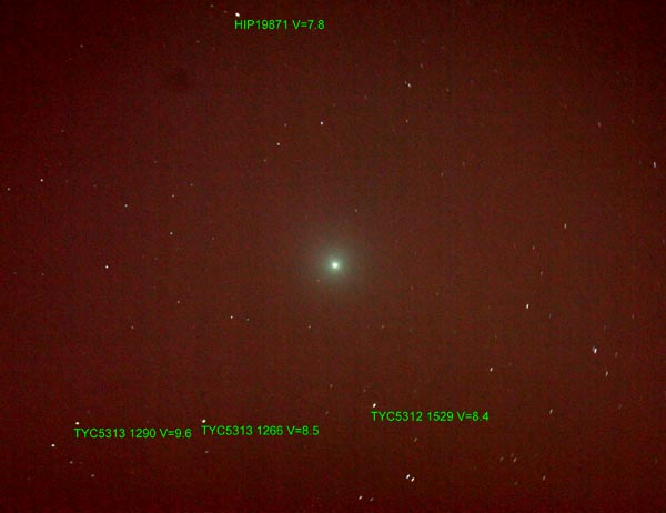 "Eilen illalla vihdoin onnistui täälläkin. Visuaalisesti en katsellut muuten kuin etsinputken läpi, sillä pääoptiikassa oli TouCam kiinni. Havaintoarvojen teossa olen hiukan heikoilla kun en ole sellaista juurikaan tehnyt. Magnitudi oli kuitenkin mielestäni heikompi kuin 4,9 koska etsinputkella näin lähellä olevan ko kirkkauksisen tähden mutta komeetasta ei vilaustakaan. Kuun kirkkaus (ja kokemattomuus) tietty vaikuttaa noin sumumaiseen kohteeseen. Koitin myös tehdä ohjelmallista kirkkaudenmittausta mutta en saanut luotettavia arvoja. Näkökenttä tällä kokoonpanolla oli noin 30' joten aika himmeitä tähtiä oli vaan komeetan kanssa samassa kentässä. DC mielestäni ruudulta katsoessani oli ainakin 5, ehkä jopa 6 - selvä kirkkauskeskittymä. Ei havaittavaa pyrstöä. Kuu haittasi havainnointia/kuvaamista merkittävästi."