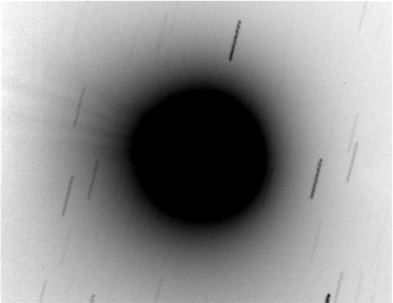 Pyrstö löytyi hyvin heikkona teleobjektiivilla ottamistani kuvista. Melkein häviää Kuun valaisemaan taustataivaaseen, mutta pituutta on reilu aste. Kun käsiteltyä kuvaa katsoo, niin siinä on huomaavinaan myös vastapyrstön kello 4-5 suuntaan!"