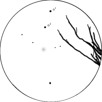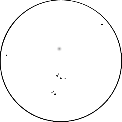"Luonnon ja kaupungin valosaastetta paljon. Kerrankin hyötyä huonosta näöstä, kiikareihin kun sai kirkkausarviota varten riittävän epätarkennusvaran ilman silmälaseja. Kuvassa on alue 1,0 x 1,5 astetta, muutama tähti merkitty mukaan. Azimuuttijalusta aiheuttaa seurannalla hieman kuvakentän kiertymistä."