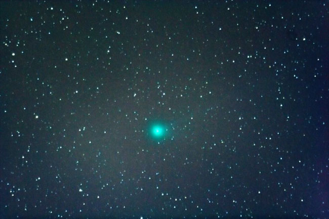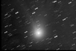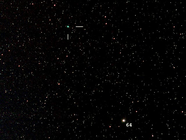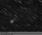 "Pääsin viimeinkin kuvamaan tätä nyt jo himmenemässä olevaa tavanomaista hieman kirkkaampaa komeettaa sen tultua 'esiin' puun takaa lähes inhimilliseen havaintoaikaan. Tämä on kieltämättä tähtitorniin sidotun kaukoputken käytön eräs epäkohta kun pihapiirissä kasvavaa, joskus näköesteenä olevaa männikköäkään ei viitsisi kovin paljoa harventaa.. Alla olevan komeettakuvan vertaaminen aikaisempiin samalla laitteistolla ottamiini kuviin osoittaa komeetan olevan yhä selvästi tavanomaisia kirkkaampi ja kookkaampi. Heikon pyrstön voisi olettaa jatkuvan pitkälle kuva-alueen ulkopuolelle. Pyrstöstä lähtevä hento säie tulee hieman paremmin esille tässä Larson-Sekanina -käsitellyssä kuvassa."