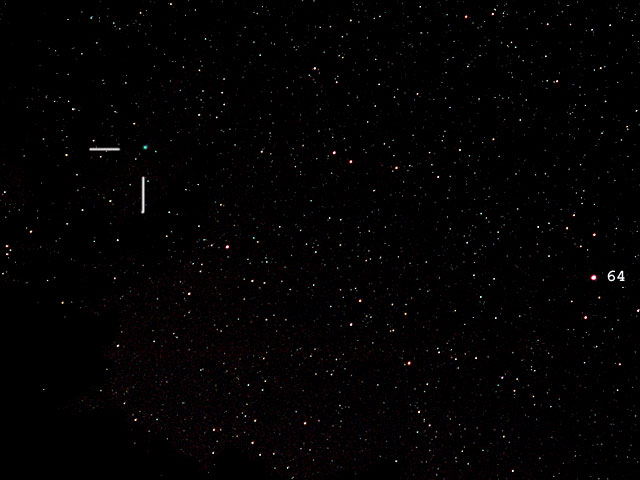 "Vieressä näkyvä tähti on 64 Cyg. Nopealiikkeinen komeetta on vuorokaudessa taivaltanut melkoisen matkan."