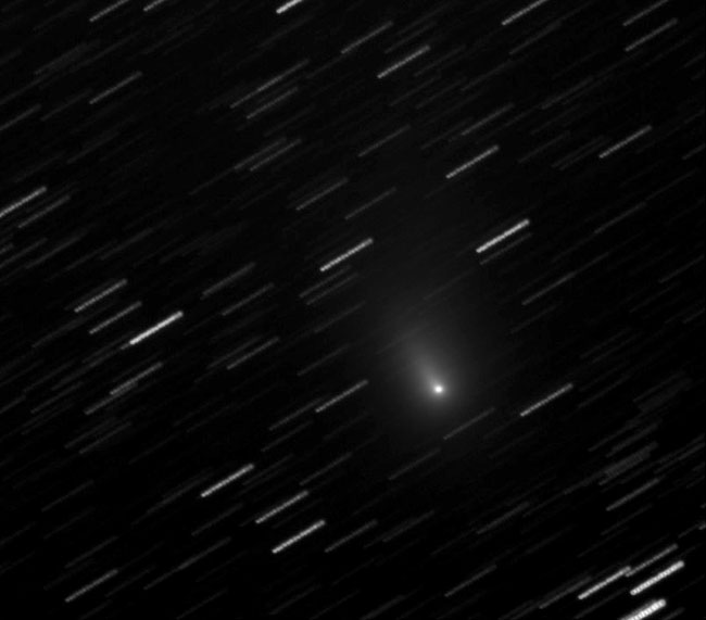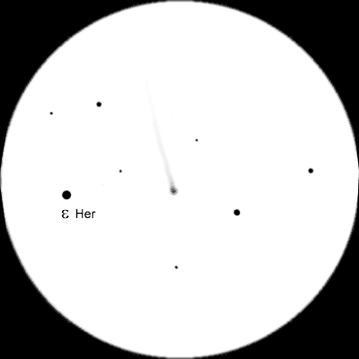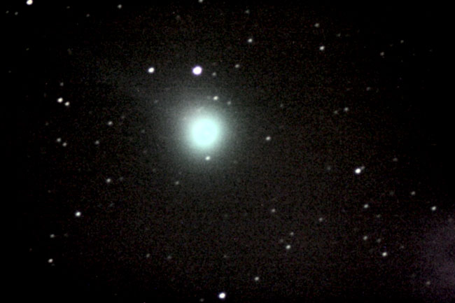 "Komettakuume on taas tarttunut! Eka sessio ja heti hyvällä kelillä. Vaikuttaa aika kirkkaalta. 4,5-5 mag. Näkyy varmaan jossain korvessa paljain silminkin? Pyrstössä näkyvissä kuitumaista poimuilua. Seuranta Meade LX-200 12" -putkella."