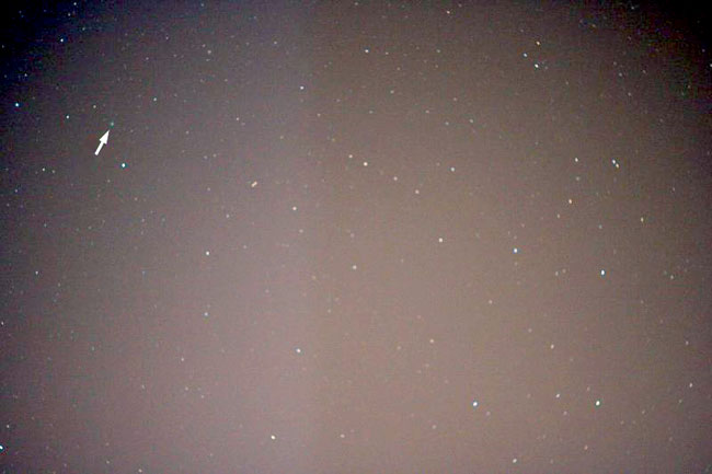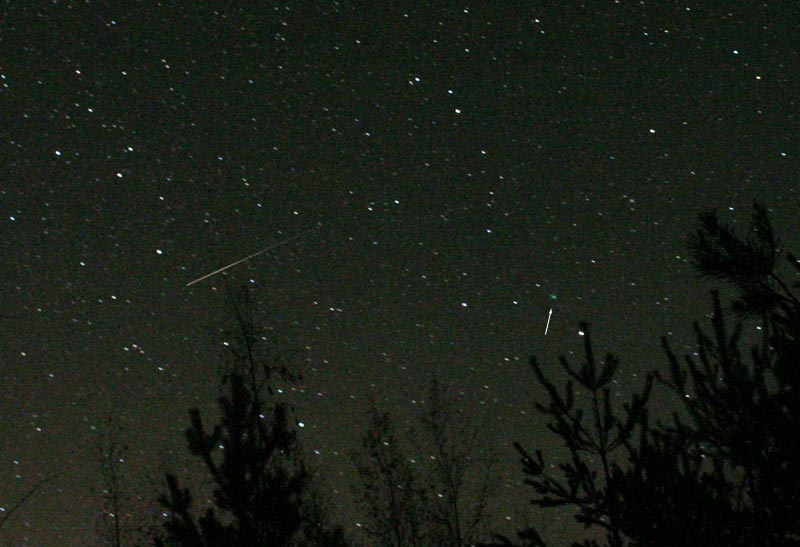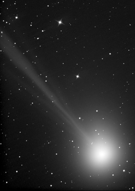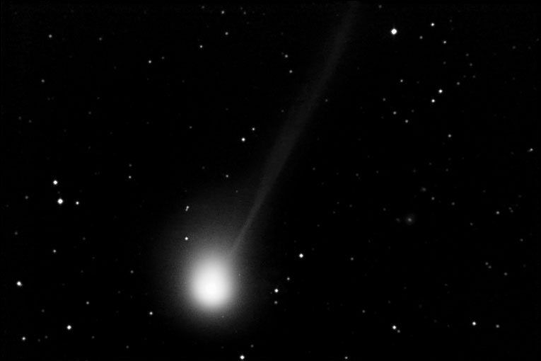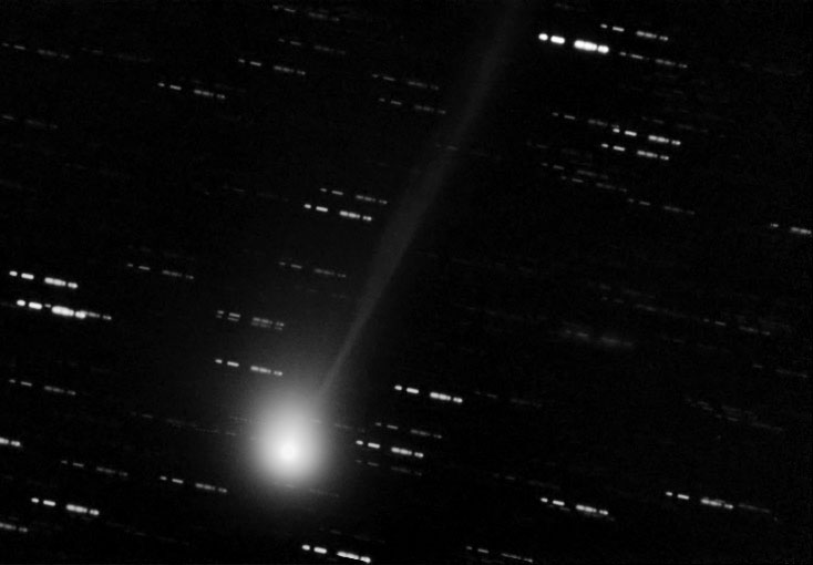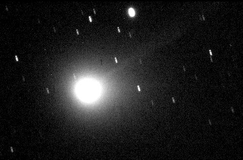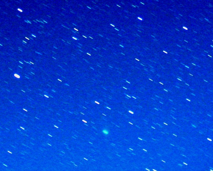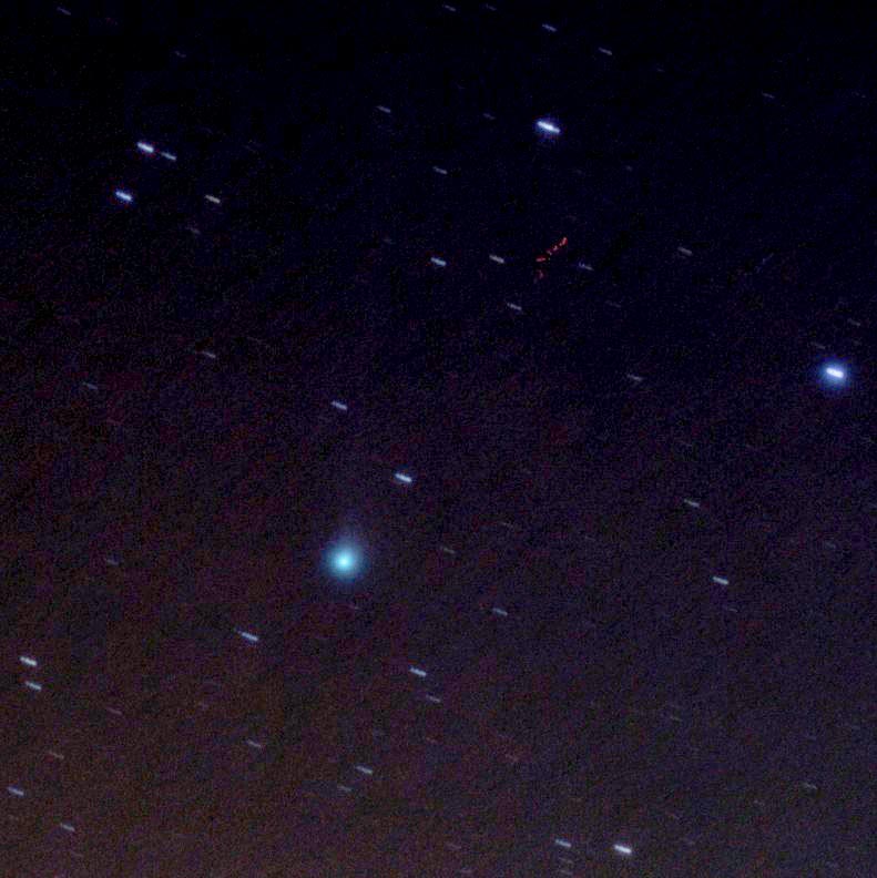 Järjestelmädigikameran kuvassa näkyy pitkä pyrstö aika hyvin. Kuvaan tuli mahdollinen meteori. Se saattaa myös olla satelliittijälki, emme ole tarkastaneet satelliittien ratoja tuolta ajalta. Kuva on rajattu isosta kuvasta.
