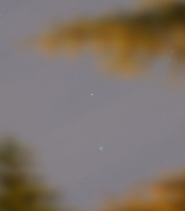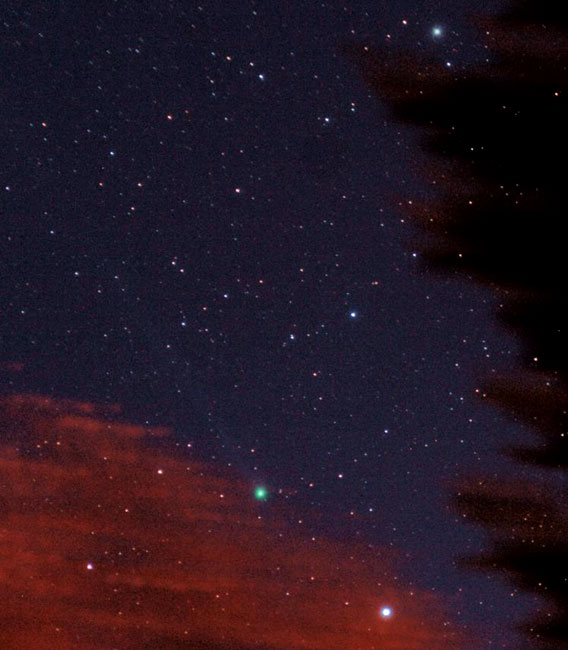 "Yritin pilvisyyden vähän väistyessä, ottaa kuvaa komeetasta. Onnistuin juuri saamaan puiden ja pilvien välistä (melkeinpä läpi ohuen yläpilven) kaksi kuvaa, 44 ja 48 sekunnin valotuajoilla. Enää en ehtinyt kiikareilla katsomaan (näkemään) kun tuli pilviä päälle ja meni pois aukosta. Ohessa ensimmäisestä rajattu kuva. Jalusta 'LIDL', seurantalaitteella varustettu."