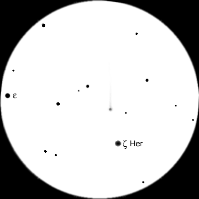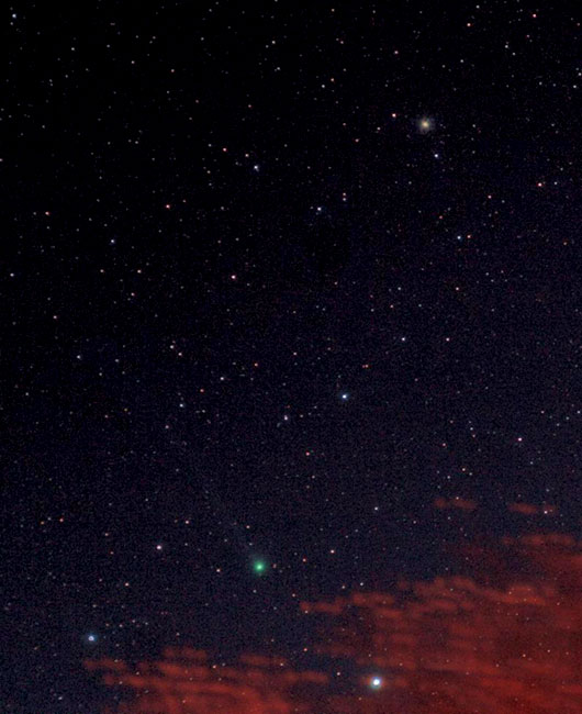 "Halusin saada kuvaa komeetasta M13:a ohittamassa. Kohde on pihaltamme hankalassa suunnassa. Ihan puun latvaa hipoen ja seuraavaa lähestyen otin joitakin. Ensimmäinen on pinottu (tähtien mukaan peräkkäin otetuista) kahdesta ja samoin myös jälkimmäinen. Oli varustettuna omatekoisella valosaastesuodattimella. Olosuhteet olivat valosaasteet huomioiden, eli tavanomaiseen nähden, kohtuulliset. Mielestäni pyrstöä näkyy kolmisen astetta (kenties ylikin). M13 näkyy lähellä kuvien ylälaitaa."