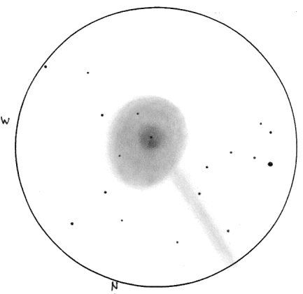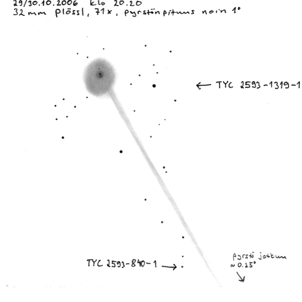 Klo 22.23, koma 9', pyrstöt >19' PA 040°, 5,5' PA 010°