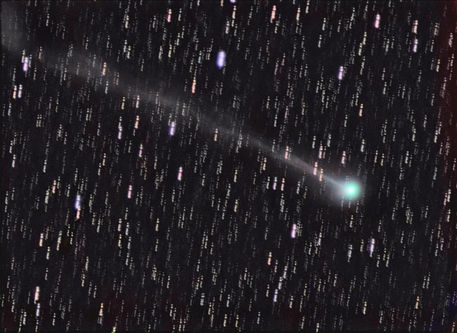 Kirkkonummen Komeetan linssiputkella otettu kuva. Kirkkunummen Komeetan ED80 linssiputkella otettu kuva SWAN:sta. 15 valotusta on pinottu kahteen erilliseen kertaan - kerran komeetalle ja toisen kerran taustataivaan tähdille. Nämä kaksi kuvaa on sitten yhdistetty Photoshopissa. Kuvassa näkyy selvästi pyrstön monihaaraisuus. "Pääpyrstössä" näkyy aaltoilevaa rakennetta. Pyrstössä näkyy itse asiassa liikettä jos 15 eri ruutua animoi."