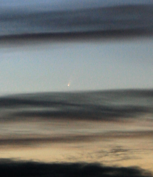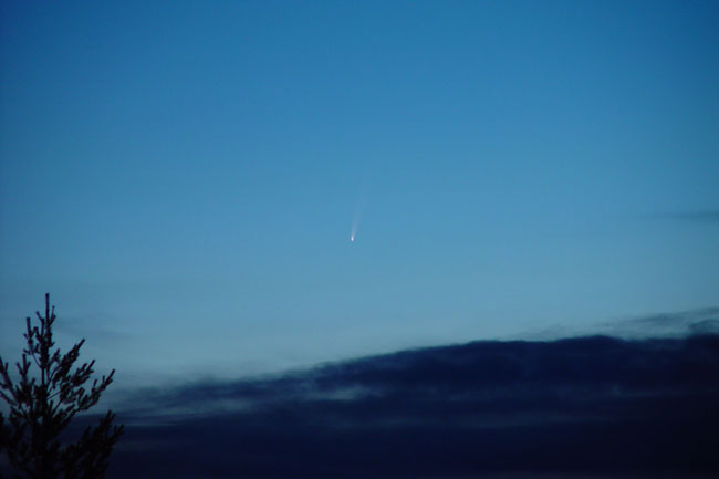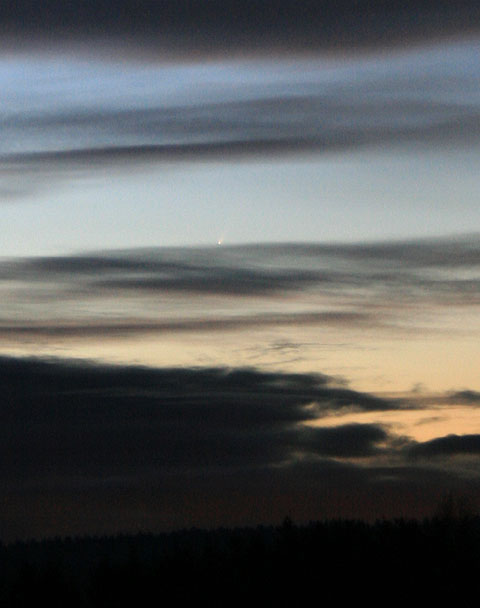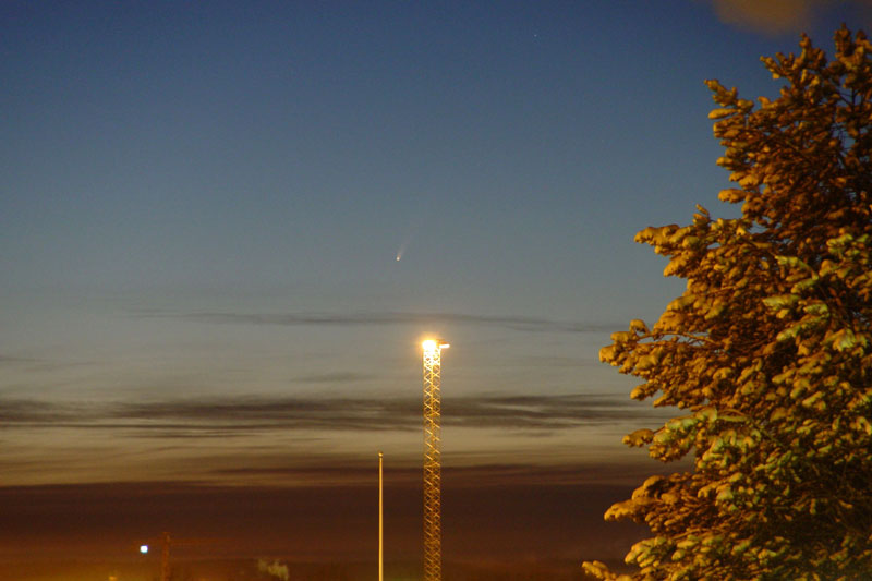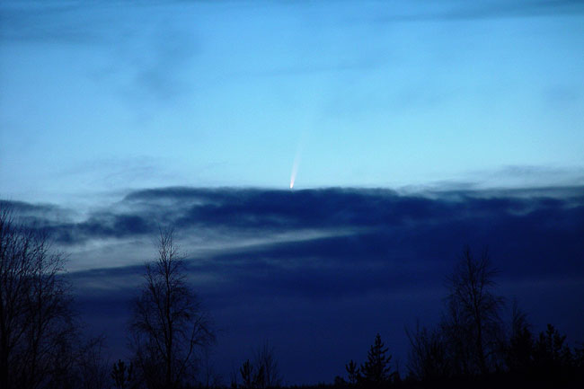 "Komeetta ja pyrstö näkyy jo komeasti paljaalla silmällä. Kahden lumisateisen vuorokauden jälkeen ihan kiva näkymä."