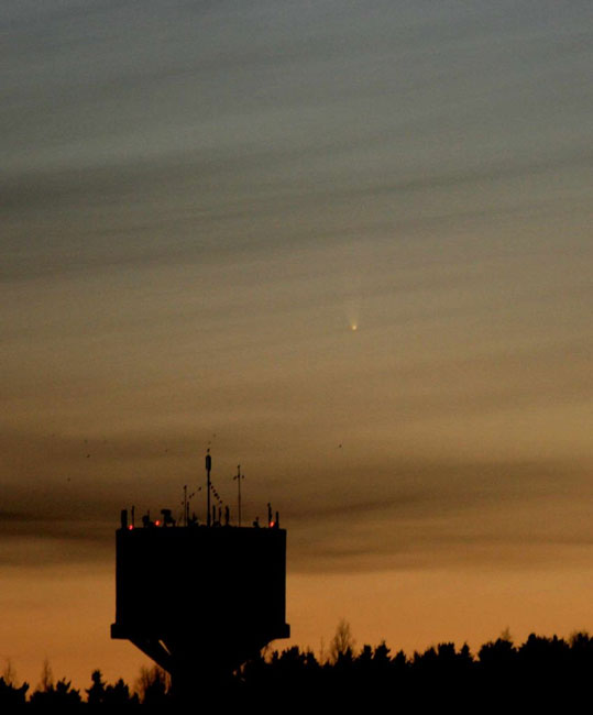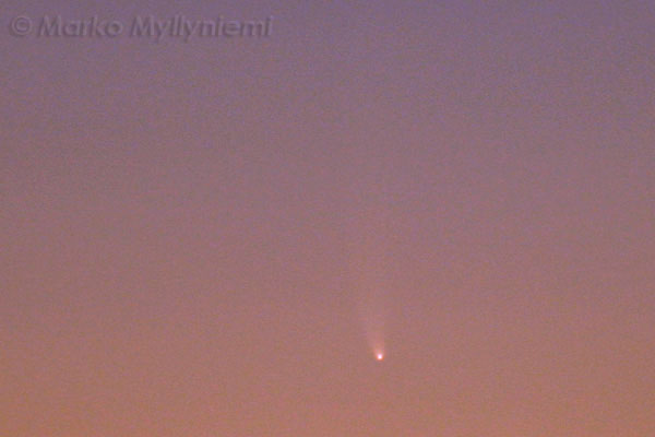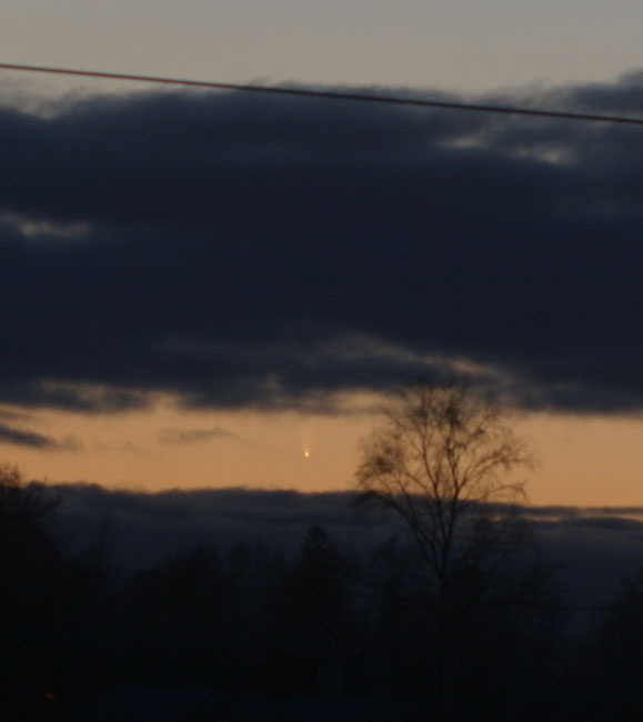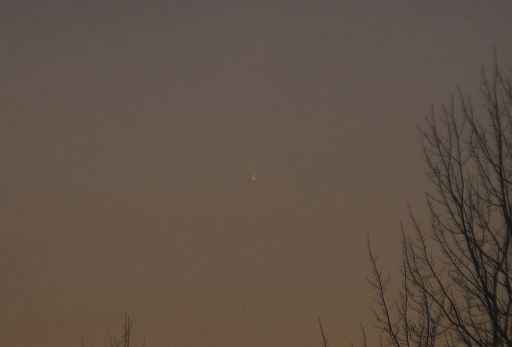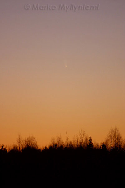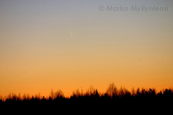"Eilen veti vesiperän, mutta tänään tunnin luokkaa kestänyt odotus kylmässä, pilviaukkoon osumisesta palkittiin. Komeetta näkyi hyvin paljain silminkin. Venus näkyi paremmin, mutta oli selvästi korkeammalla. Komeetta oli vain noin 2 astetta horisontista, jossa ekstintiotaulukolla noin 2,5 magnitudia suuremman ekstinktion kuin Venukselle. Jäi taas lyhytaikaiseksi katselu ja kuvaus, eikä kunnon kirkkausarviosa voi puhua, mutta arvelisin sen todellisen kirkkauden olleen vähintään Venuksen tasolla luultavammin vielä kirkkaampi. Kuva on vain rajattu osa, muuten käsittelemätön."