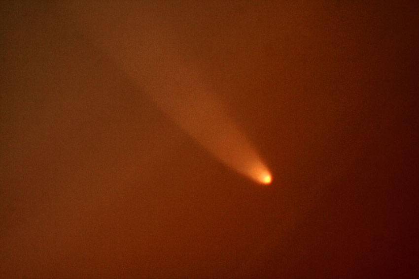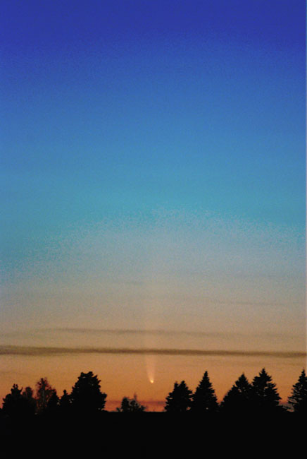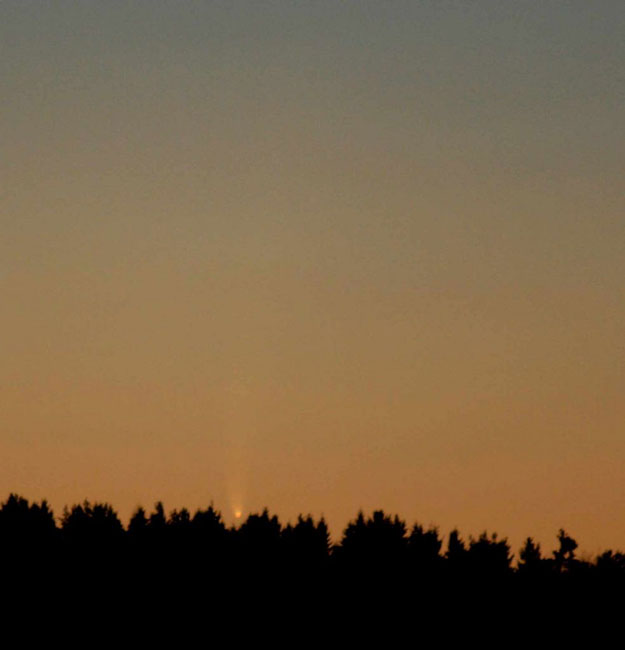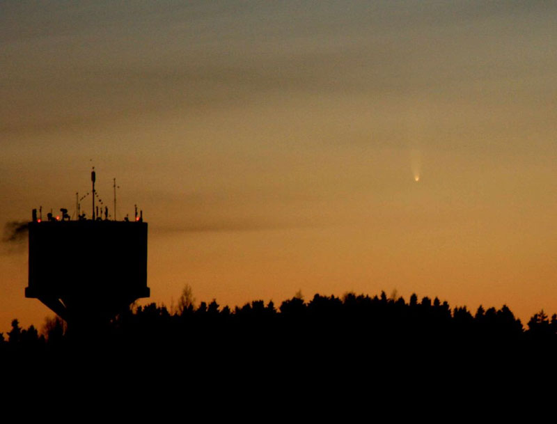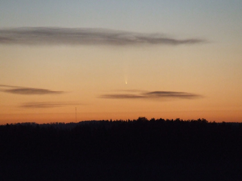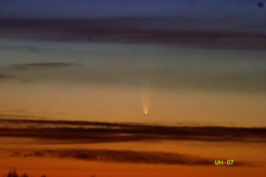 "Pohjois-Karjalassa on yleensä aina ollut taivas pilvessä, varsinkin yöllä. Nyt yllättäen illalla oli kohtuullisen pilvetöntä ja läksin autolla Selkäsalmen sillalle kuvaamaan. Taivaanrannalla oli hiukan pilviä enkä löytänyt komeettaa kiikarilla puolen tunnin etsimisestä huolimatta. Olin jo lähdössä pois, kun komeetta ilmestyi kiikarin näkökenttään ja myöhemmin se näkyi myös ilman kiikariakin. Otin parikymmentä kuvaa digikameralla, mutta koska taivaanranta oli niin punainen, ei niistä kehuttavia kuvia tullut."